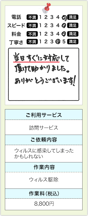 ご訪問日時を調整いたします。訪問及び状況確認後、提示したお見積 りにご了承を頂いた上で作業を行います。