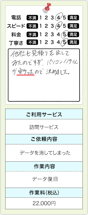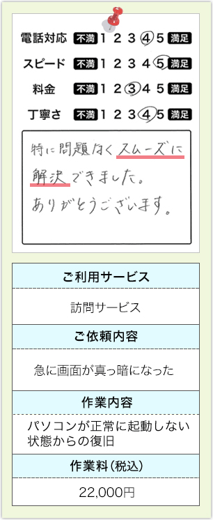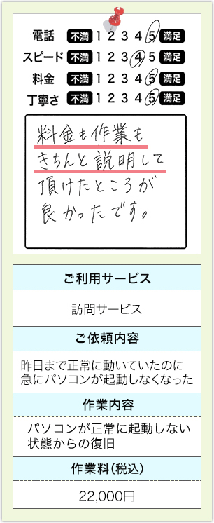 パソコンの故障状況によって異なります。まずは、電話やメールでご相談ください。